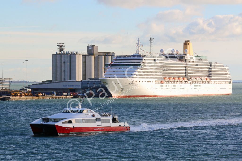 P&O Cruises Arcadia at Berth 38/39 Southampton on 6th January 2015.Red Jet 4 pases in the foreground.