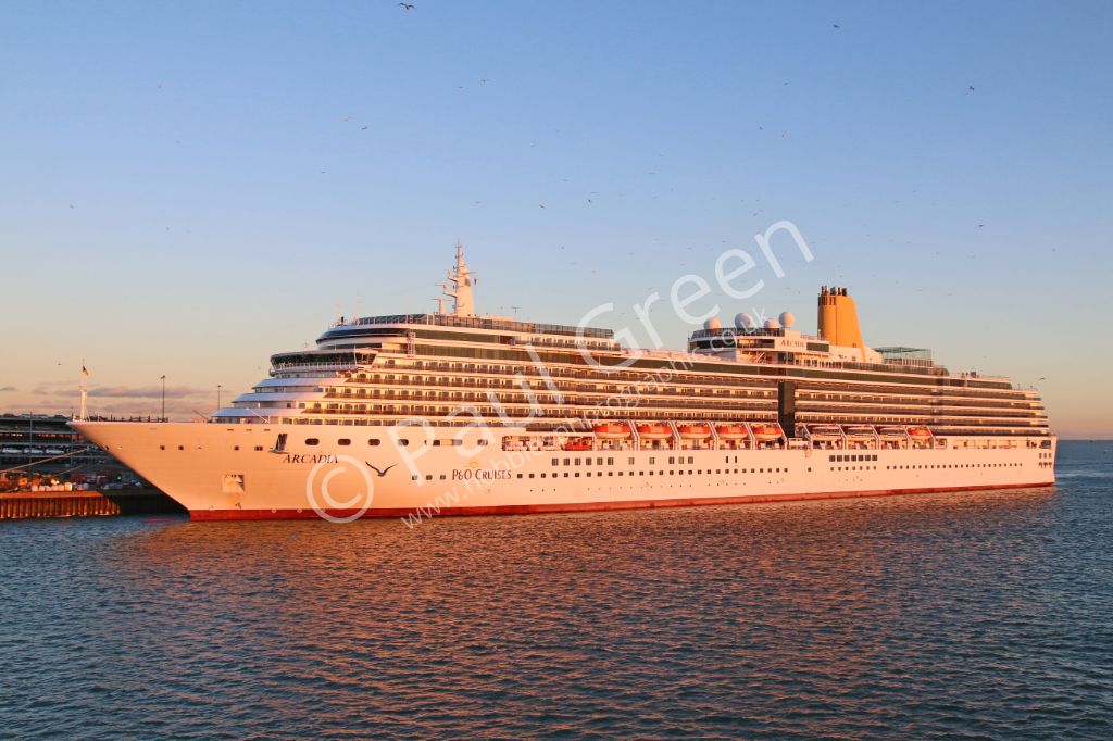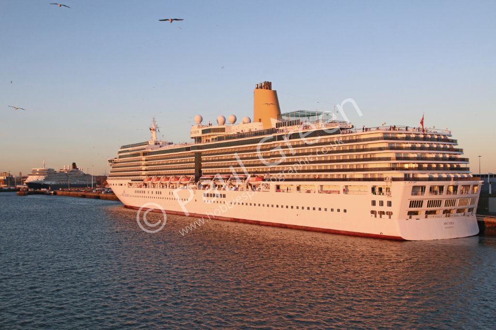The evening sun catches P&O Cruises Arcadia at Berth 38/39 Southampton on 6th January 2015.Cunards Q...