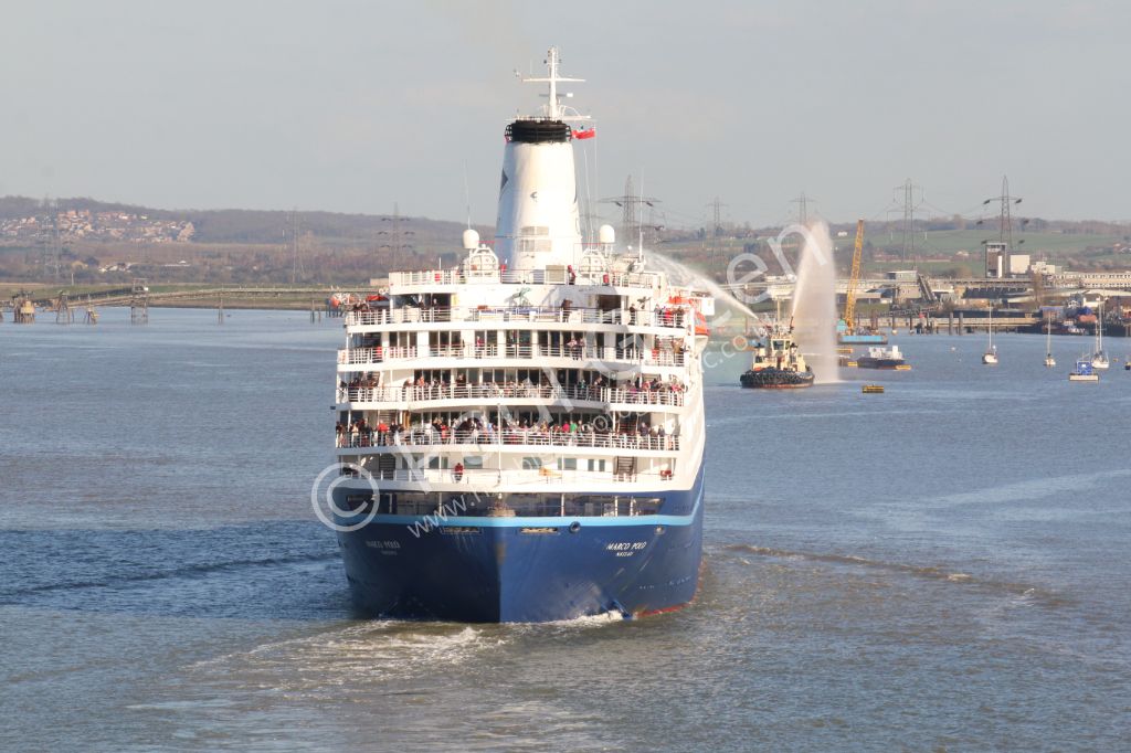 A view of Marco Polo at London Cruise Terminal,Tilbury on 27th March 2015.The pilot boat is nearby.
