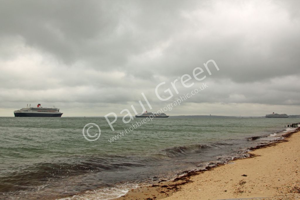 Queen Elizabeth,Queen Victoria and Queen Mary 2 head line astern down Southampton Water on 13th July...