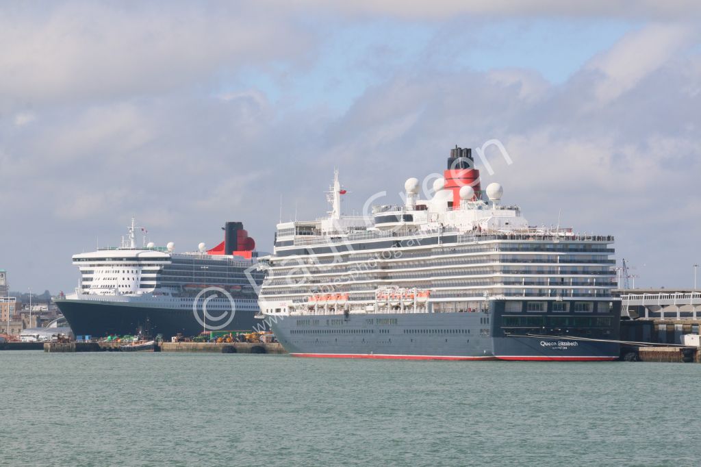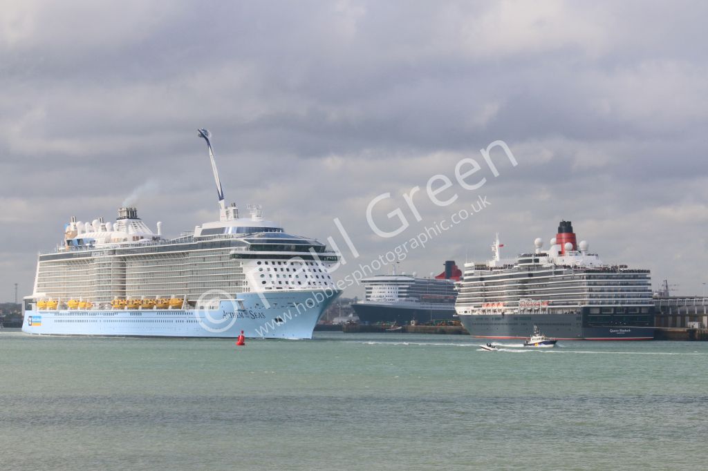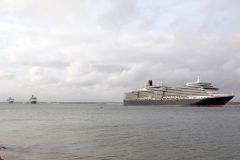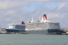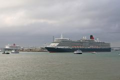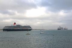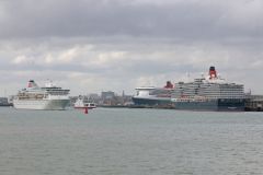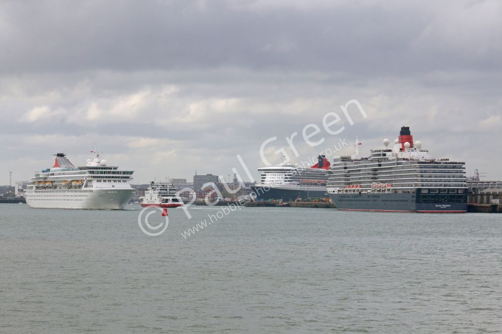 Fred Olsens cruise ship Balmoral passing the Queen Mary 2 and Queen Elizabeth in Southampton on 3rd ...