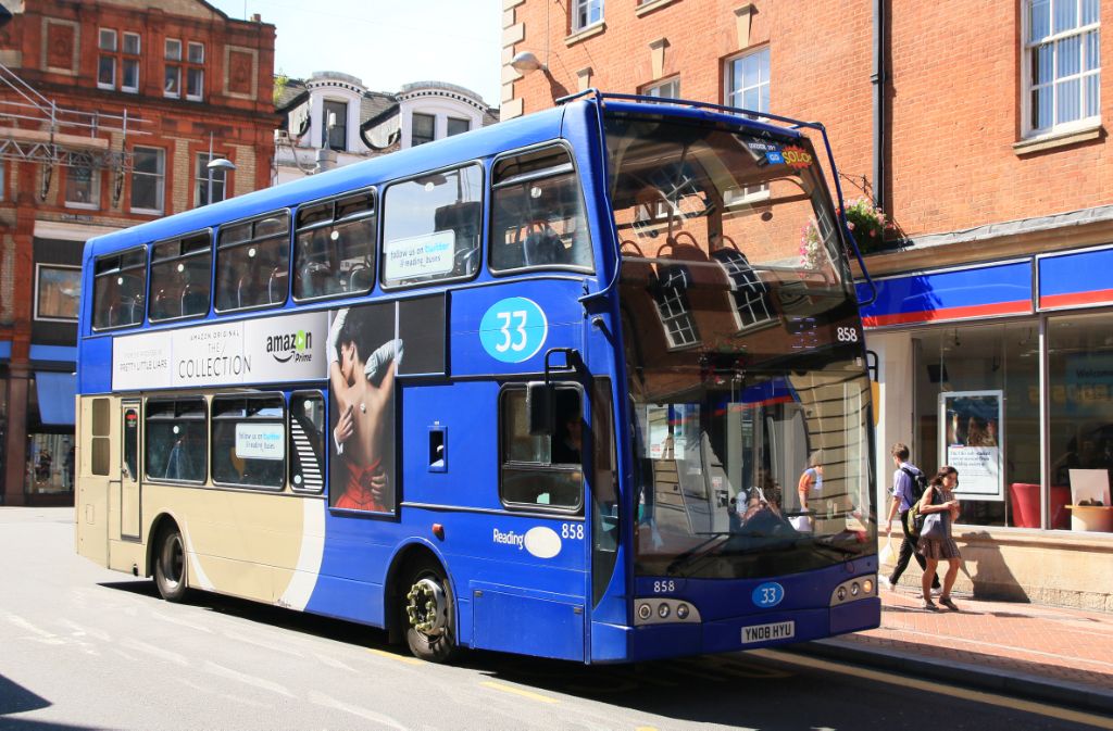2008Scania N230 UD/East Lancs Olympus No.858 (YN57FXE) seen in Reading on 24th August 2016.