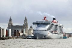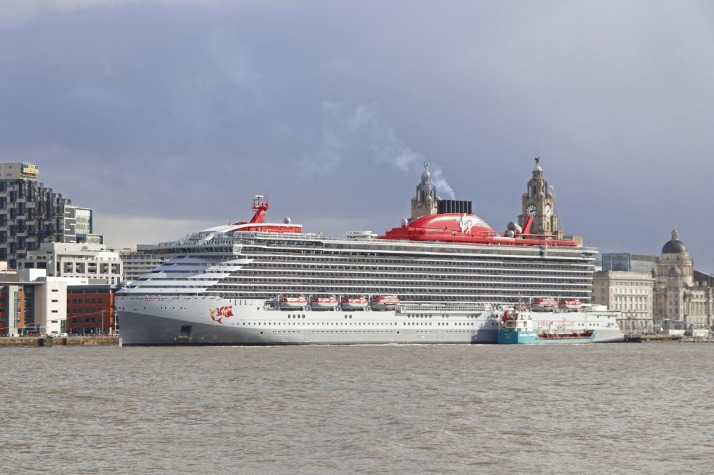 Virgin Cruises new cruise ship Virgin Lady at berth in Liverpool on 25th February. The Liver buildin...
