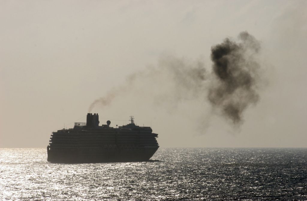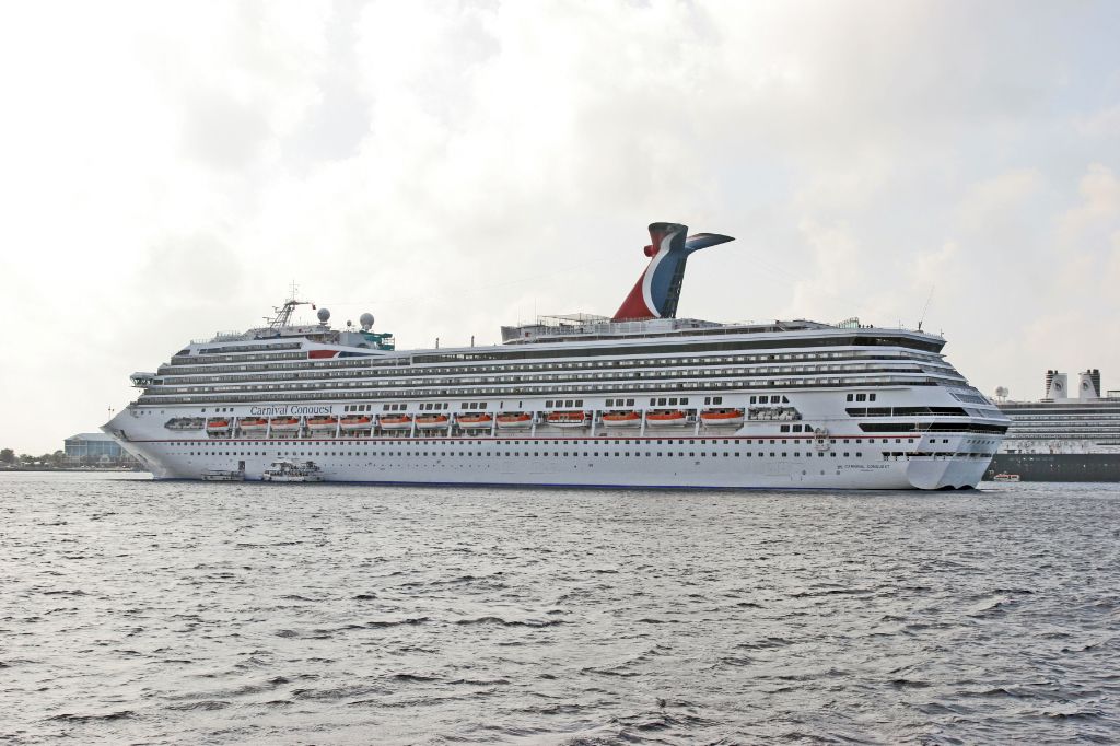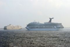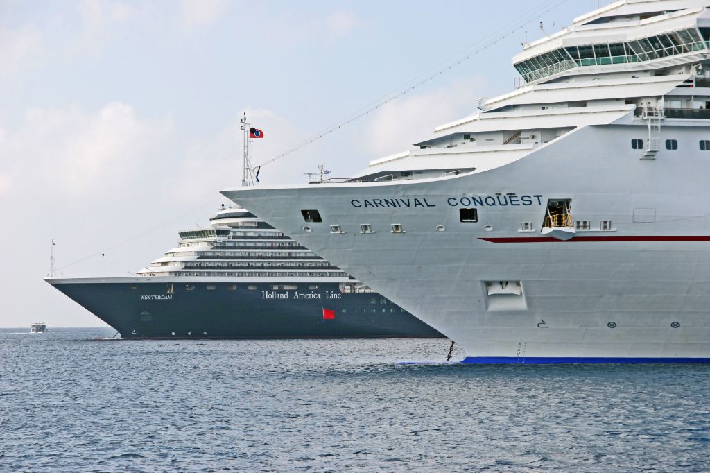 The bows of Holland America Lines Cruise ship Westerdam and Carnivals Carnival Conquest anchored off...