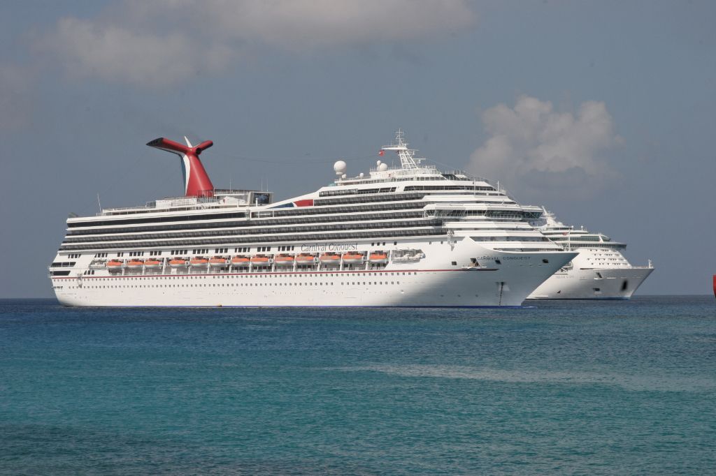Holland America Lines Cruise ship Westerdam and Carnivals Carnival Conquest anchored off Grand Cayma...