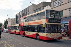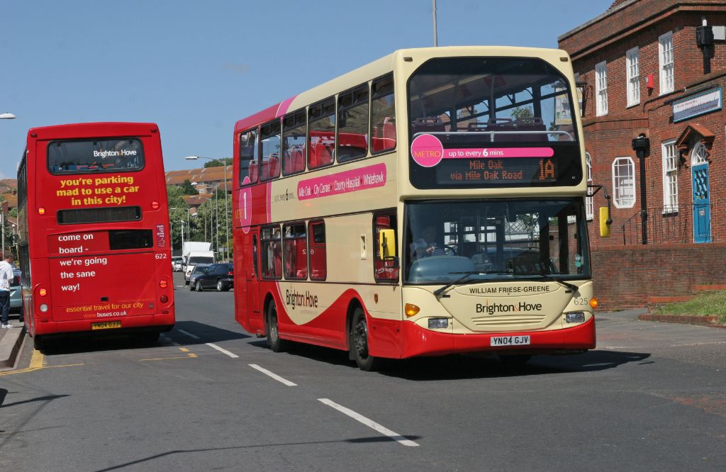 Two Go-Ahead Brighton and Hove 2004 Scania OmniDekka N94 UD/East Lancs vehicles Nos.622 (YN04GJJ) an...
