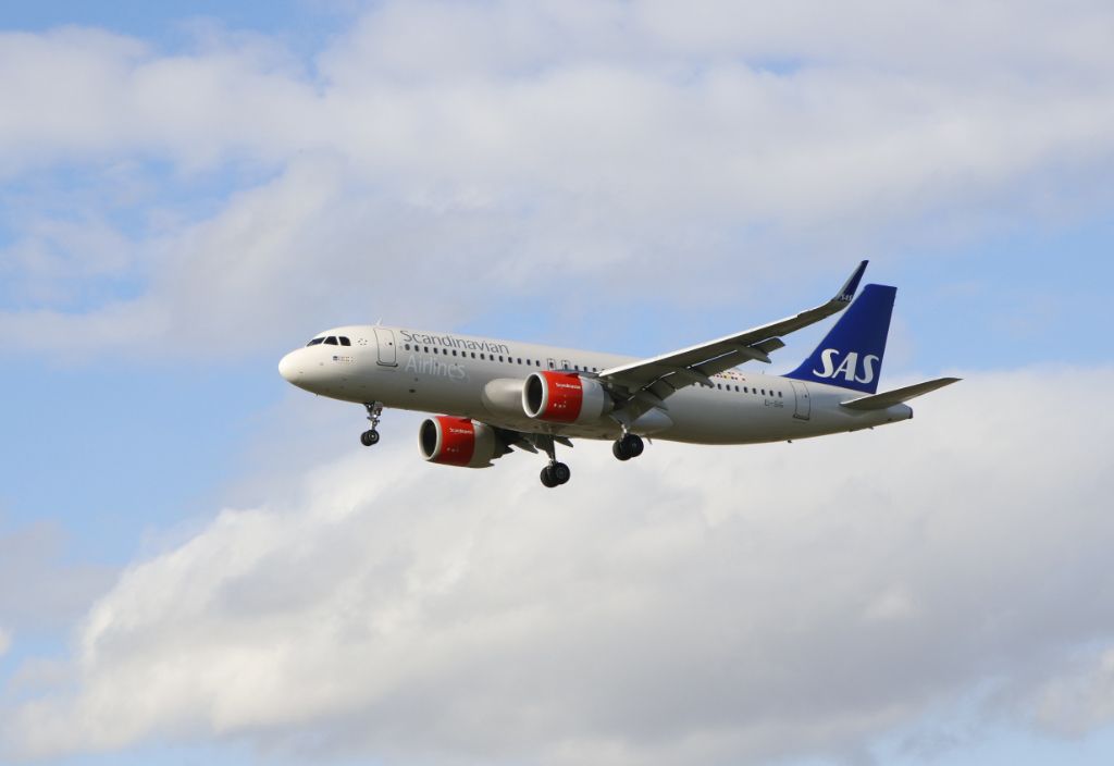 Scandinavian Airlines (SAS) Airbus A320neo EI-SIG delivered in July 2018 on finals for Runway 27L at Heathrow on 19th August 2021 arriving from Copenhagen.