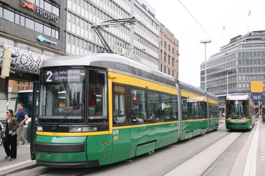 Helsinki MLNRV III Transtech tram new from 2012.this is No.409 seen at the central station on 4th July 2017.