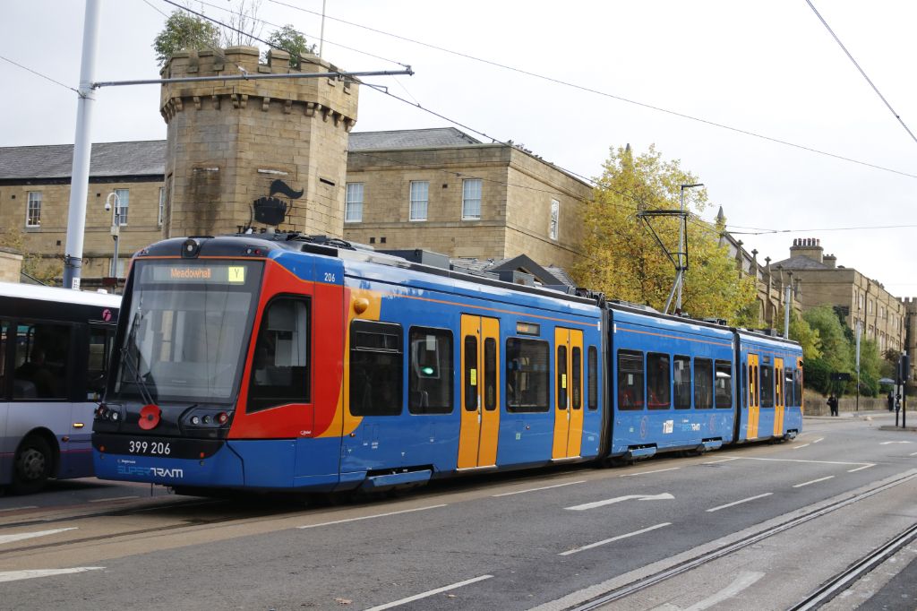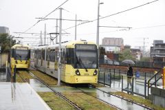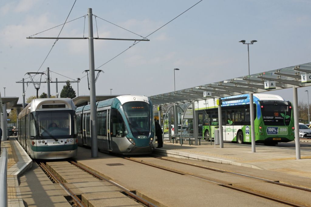 Toton Lane on 16th April 2019 with Tram Nos 213 and 217 and Nottinghamshire County Council 2018 BYD D9UR LJ18FGZ working a Route 510.