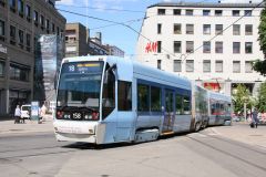 Oslo SL95 eight axle tram No.158built by Ansaldo/Firema (now Ansaldobreda) between 1989 and 2006 seen in Stortorvet near the Cathedral on 28th June 2017.
