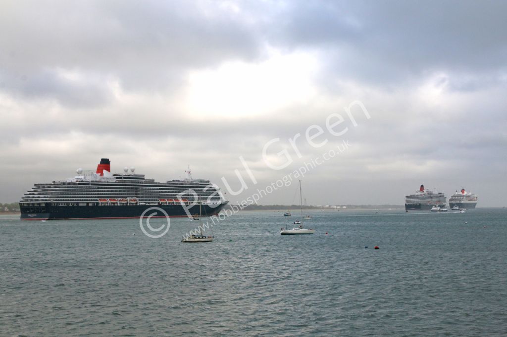 Queen Elizabeth,Queen Victoria and Queen Mary 2 head line astern down Southampton Water on 13th July...