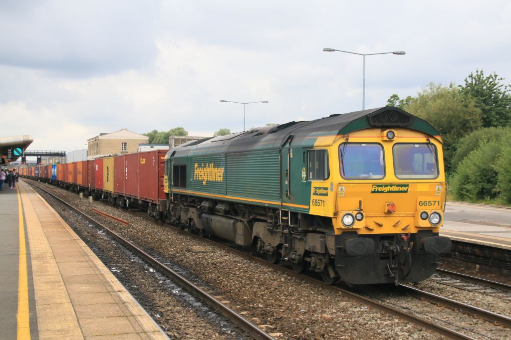 Freightliner Class 66 No.66571 seen on an up service at Swindon on 26th July 2016.