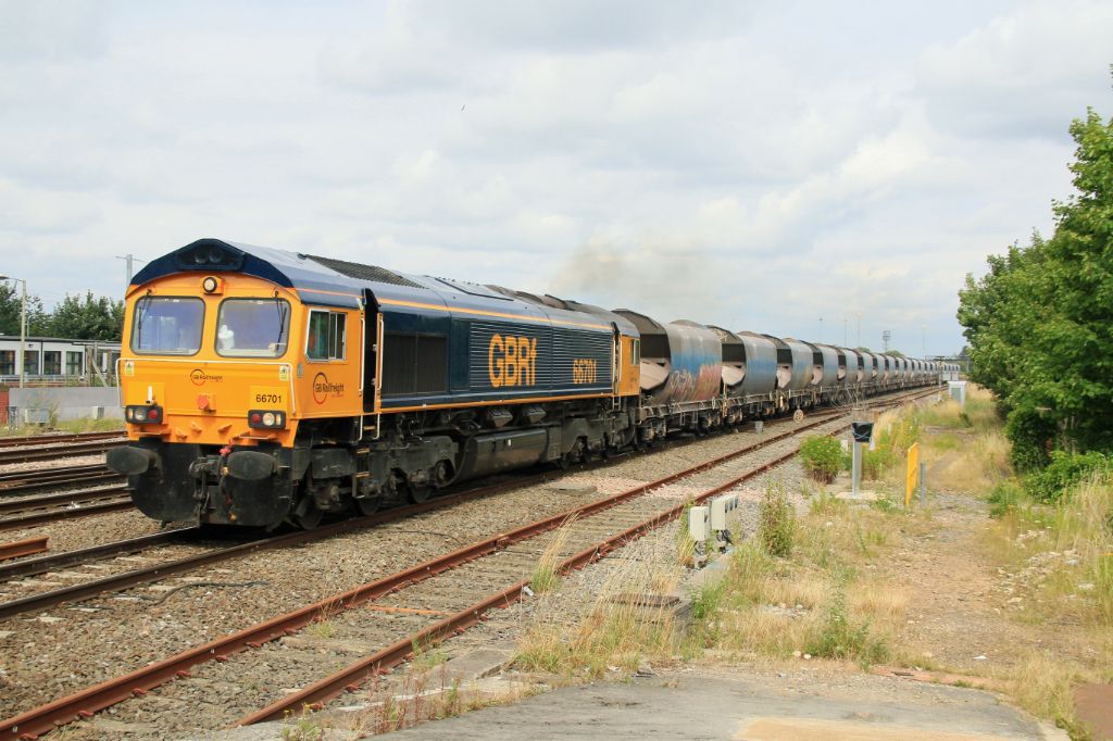 GB Railfreight (GBRf) Class No.66701 seen on a down stone empties passing Swindon on 26th July 2016.