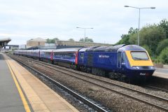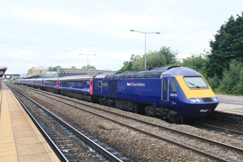 GWR HST with Power Car No.43027 in '90 Glorious Years' livery seen at Swindon on 26th July 2016 with...