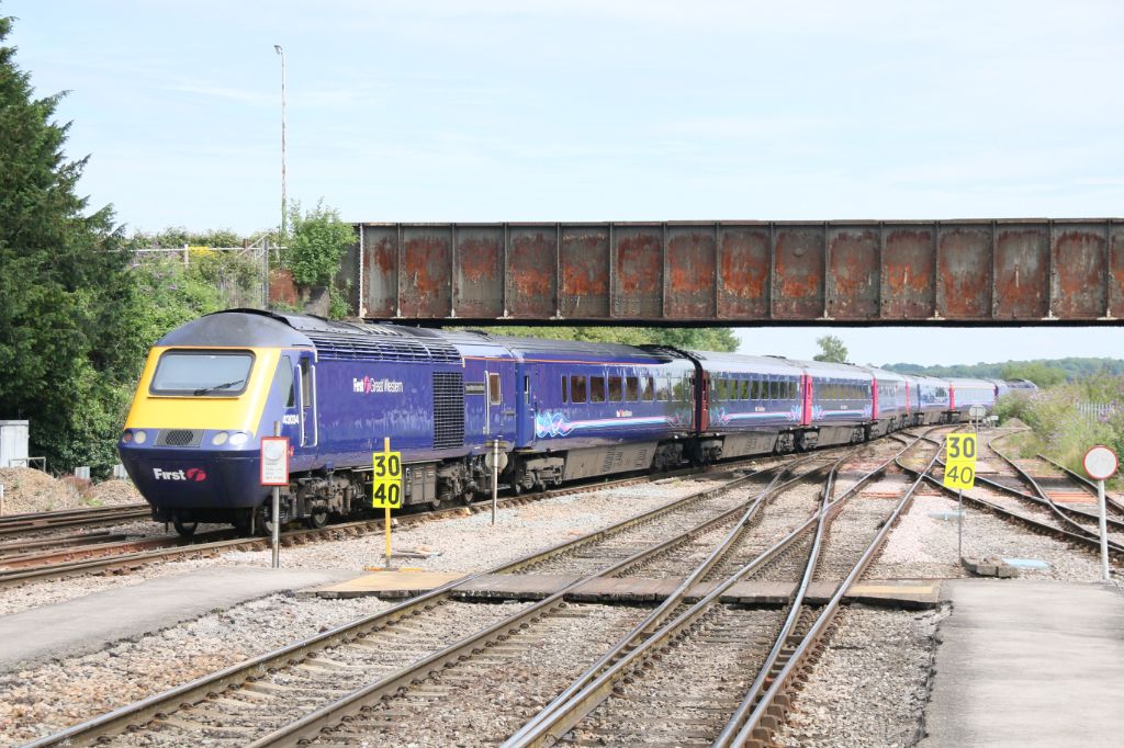 GWR HST Power Car No.43148 at the head of a down service in reverse formation entering Westbury on 8...