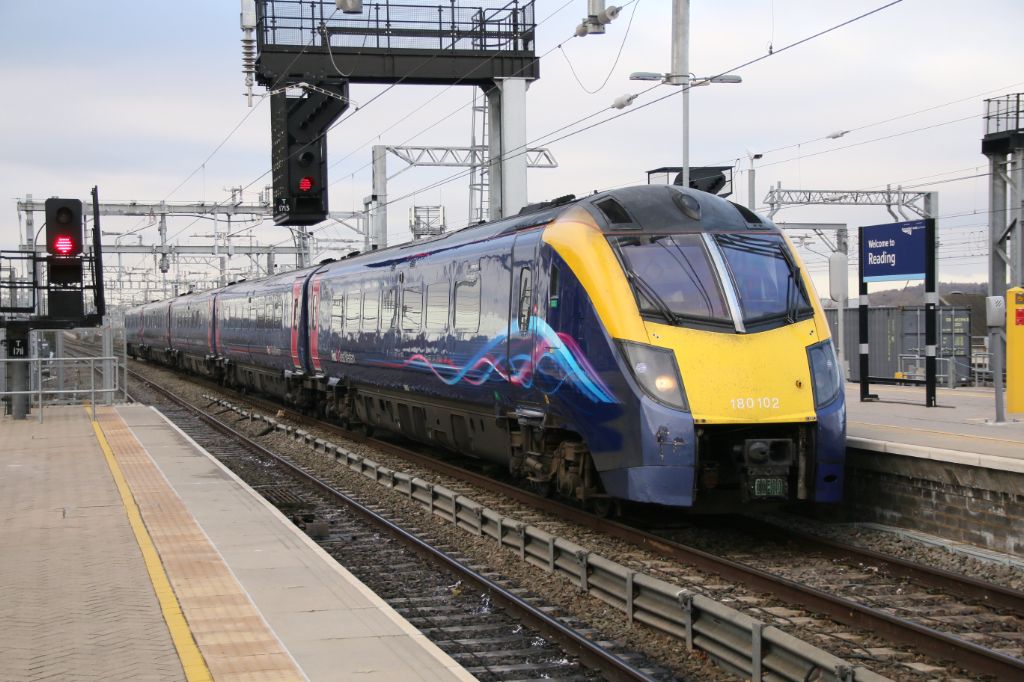 GWR Class 180 No.180102 on an up service to Paddington seen at Reading on 29th November 2017.