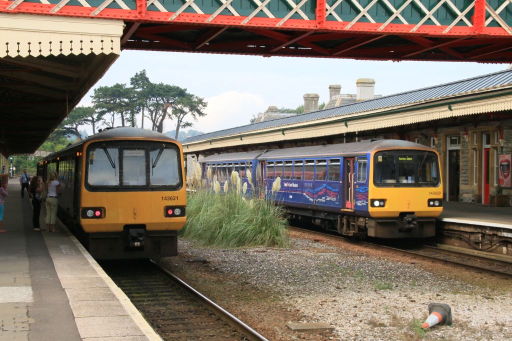 GWR Class 143s pass at Torquay on 25th August 2016.No.143621 on an Exeter stopping service and 14362...