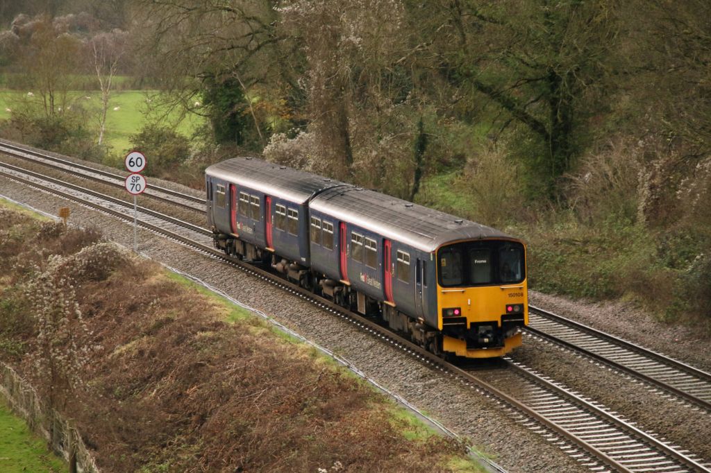 GWR Class 150 No.150108 working a Bristol Temple Meads to Frome service in the Avon Valley near Limp...