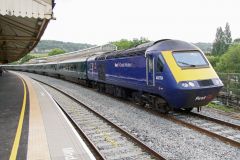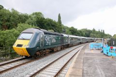 GWR HST Power Car No.43187 with 'The Welshman' adornments seen in Bath on 11th June 2017 at the rear...
