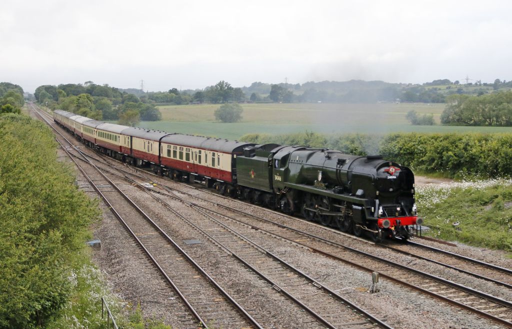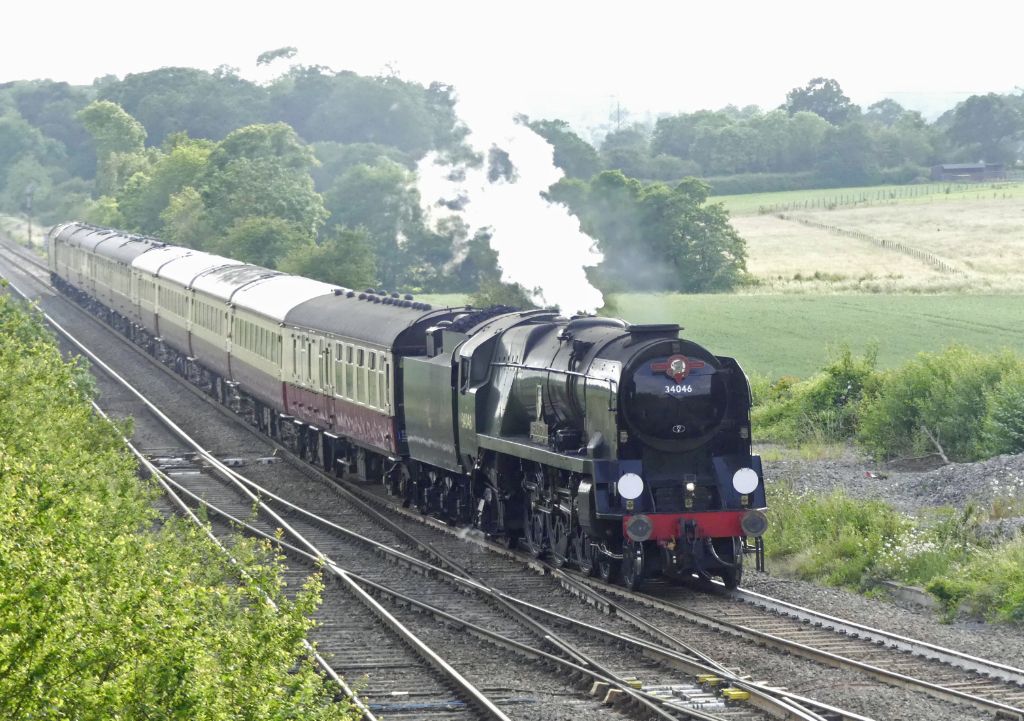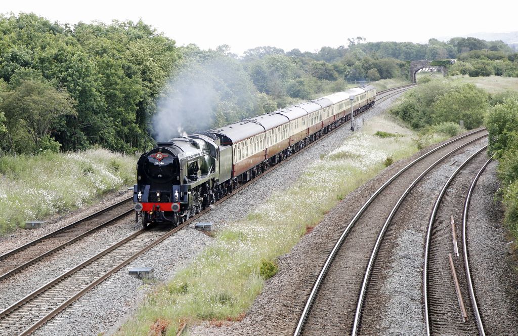 Rebuilt West Country Class Bullied Pacific No.34046 Braunton approaching Fairwood Junction with the ...