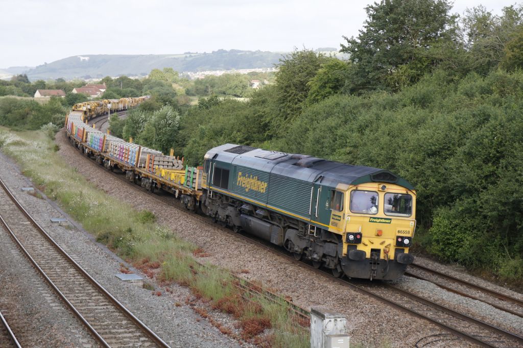 With the Westbury White Horse in the background Freightliner Class 66/5 No.66558 at the rear of a ci...