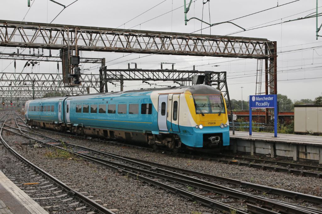 Transport for Wales service arriving at Manchester Piccadilly with unit 175009 still in Arriva liver...