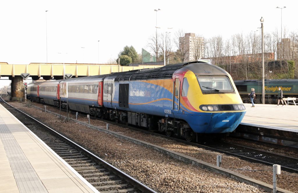 East Midlands HST Power Car No.43058 heading the 11:45 Nottingham to St.Pancras entering Leicester o...