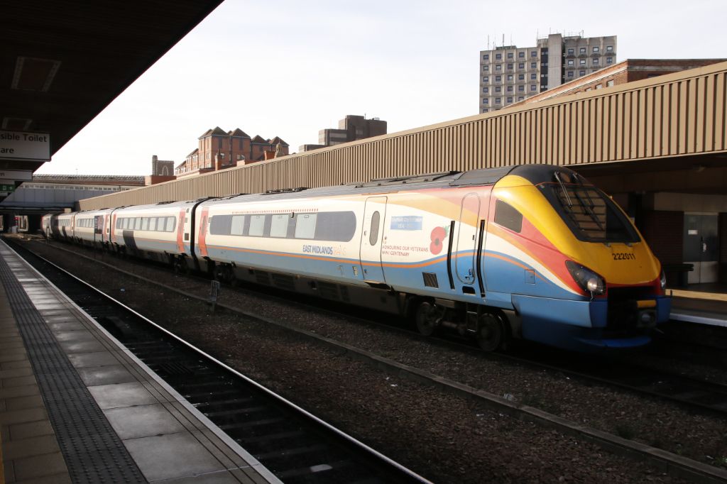 East Midlands 5-Car 'Meridian' Class 222 No.222011 working the 11:05 St.Pancras to Nottingham enter...