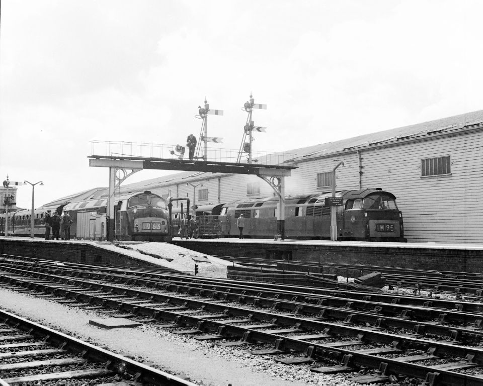 Exeter St.Davids in the later 1960's.WR Warship Class diesel hydraulic No.D870 'Zulu' has arrived wi...