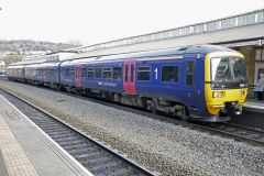 GWR Class 142 No.142063 at the rear of a four car formation to Exmouth at Exeter St. Davids on 8th A...