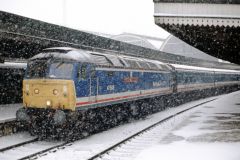 Class 47 No.47-583 'County of Hertfordshire' with a train of N.S.E. Mk1s in a blizzard at Paddington...