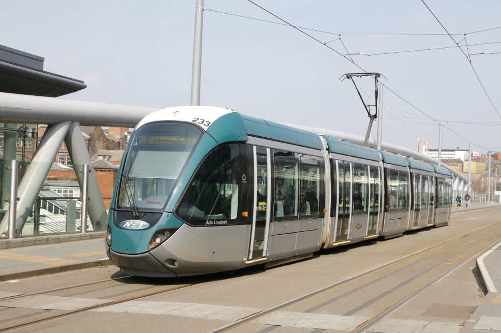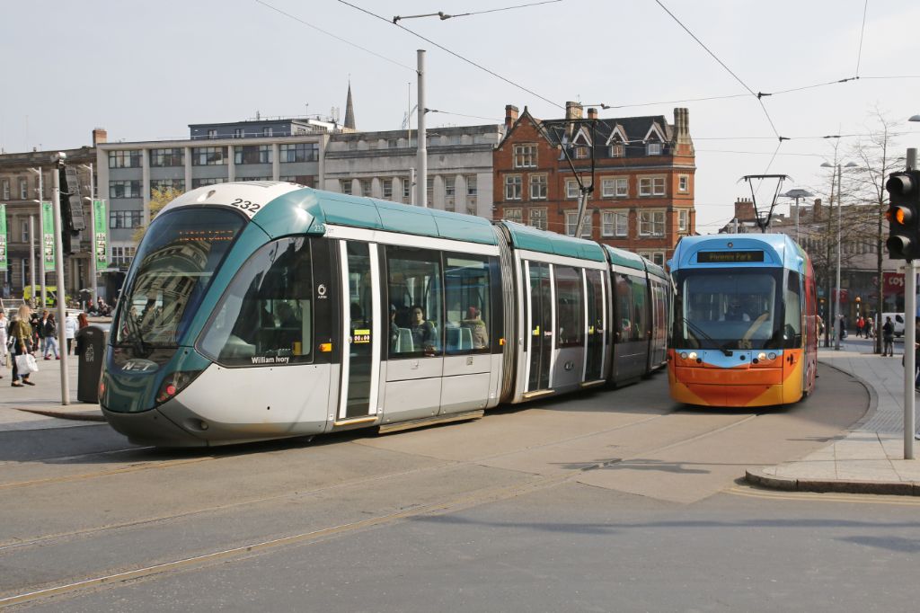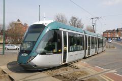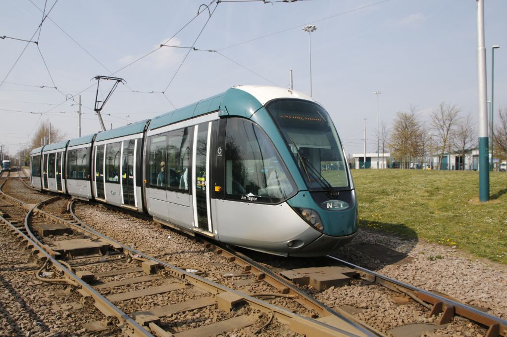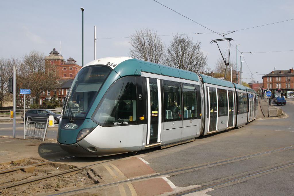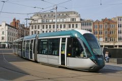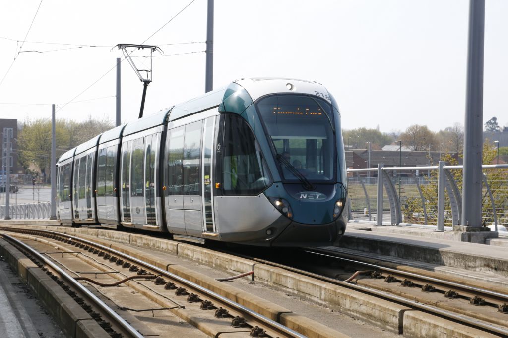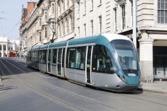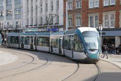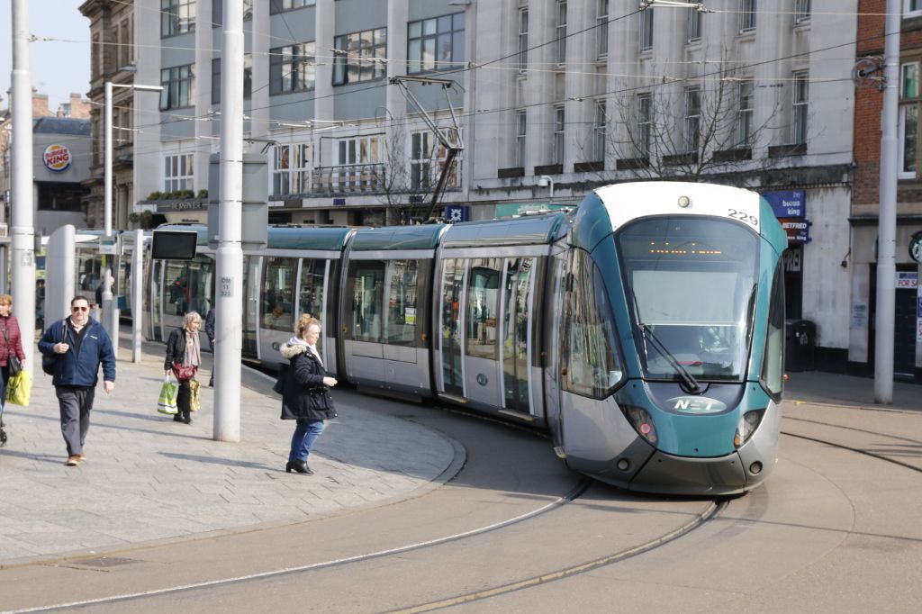 2013/14 Alstrom Incentro 302 No.222 leaves Nottingham Station on a Hucknall to Toton Lane service a...
