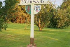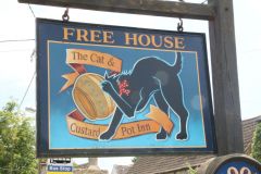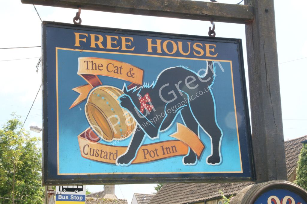 Pub sign at the Cat & Mustard Pot Inn,Shipton Moyne,South Cotswolds,Gloucestershire 20th June 2014.The name Shipton, recorded in 1086, indicates the early importance of sheep-farming in the parish economy; the affix Moyne, recorded from 1287, was acquired when the manor was owned by the Moyne family.
