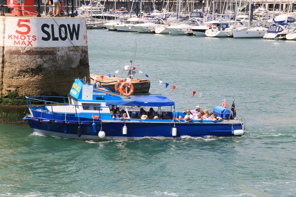 The pleasure craft Shepherd Lass leaving Torquay Harbour on 5th August 2016 on a pleasure trip aroun...