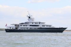 Leander G was designed by Claus Kusch, who had previously designed two yachts named Katalina for the original owner, Brigadier Sir Timothy Landon. Her steel hull hull has a bulbous bow, a classic canoe stern, together with a helicopter deck and topped by a three deck aluminium superstructure - six decks in total. She has a range of communal guest areas including a Main Saloon and Dining room on her Main Deck, a Boat deck saloon, Jacuzzi Deck, Observation Deck and Study, a Fitness room, a Dive Room and Swim Platform. There are 10 suites in total, consisting of two Master suites with office/study and a forward facing saloon, 3 double guest cabins with en-suite bathrooms and 5 twin guest cabins with bathrooms. In all, she can accommodate 22 guests as well as a crew of 23,It is seen off Calshot Spit outbound on 3rd June 2015.
