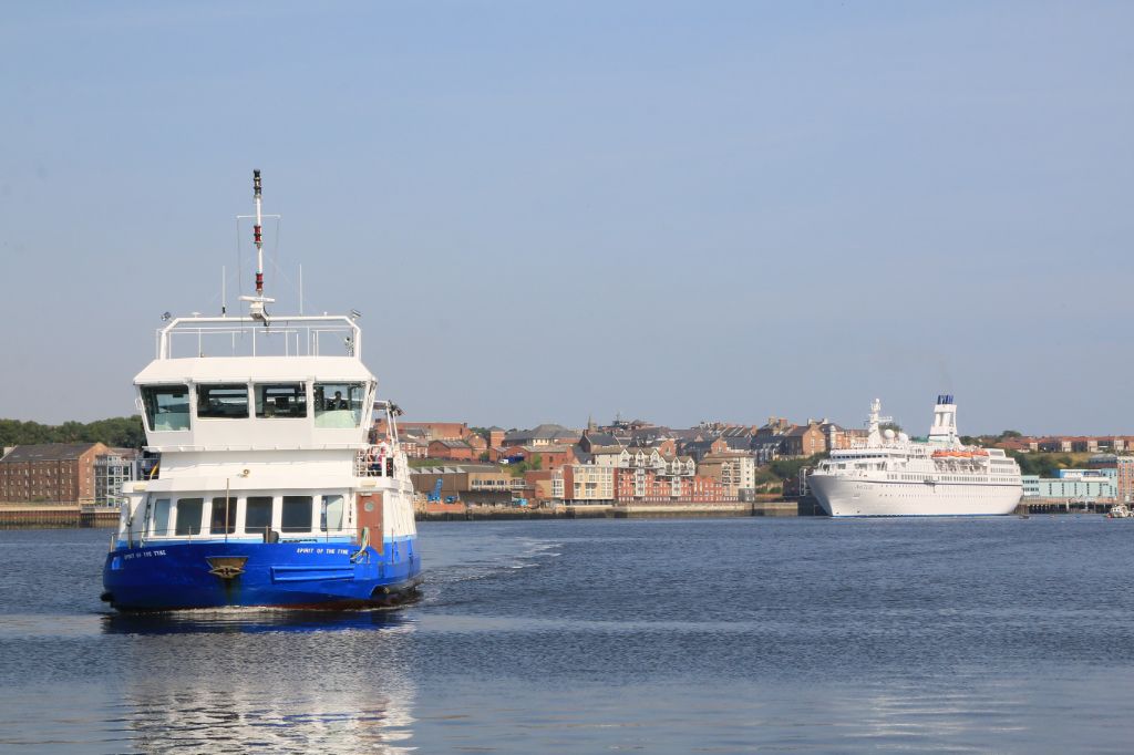 Tyne Ferry Spirit of the Tyne approaching South Tyneside on 16th August 2016.The cruise ship Astor i...
