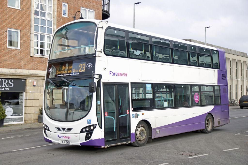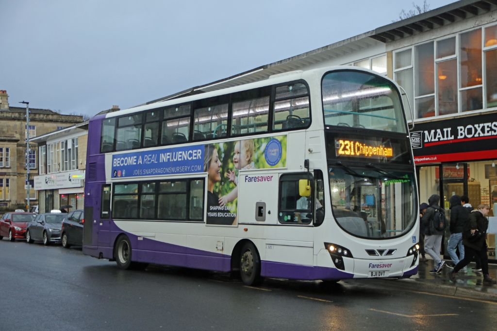 BJ11DVT seen in central Chippenham on 3rd January 2024 working a 231 service from Bath.